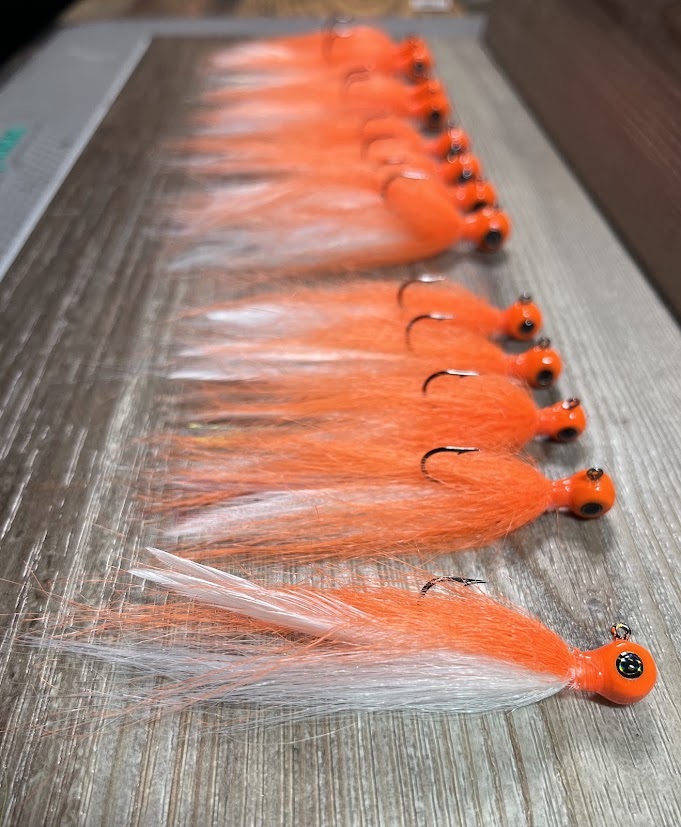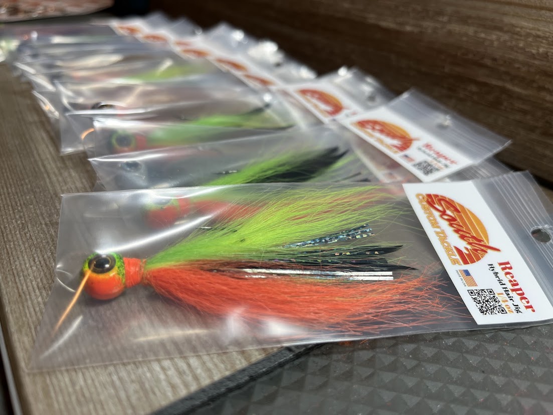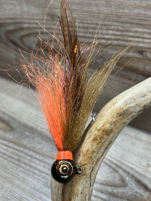 A hybrid hair and hackle feather jig that brings the action like you’ve never seen! Custom hand painted heads with real 3D eyes and UV Resin cured for optimal hardness, on a razor sharp Eagle Claw hook. Each jig is hand tied with a split hackle feather tail, flash/tinsel, and then finished with fur. Available in three sizes; 1/4oz, 5/16oz, and 3/8oz. Sold individually. Made in Wisconsin.